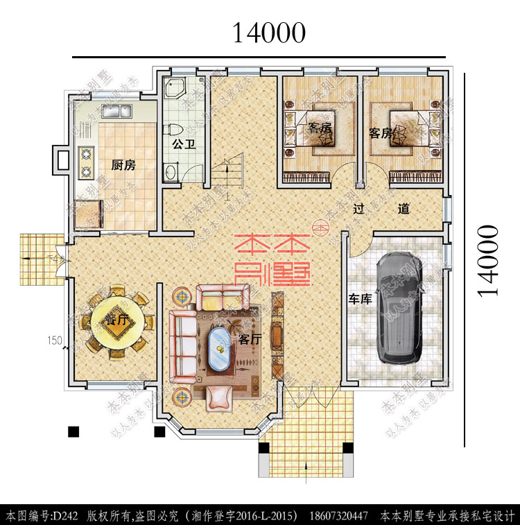 一層:門廳,客廳(復(fù)式挑空廳),二間臥室,廚房,餐廳,公衛(wèi),樓梯,車庫(kù)。