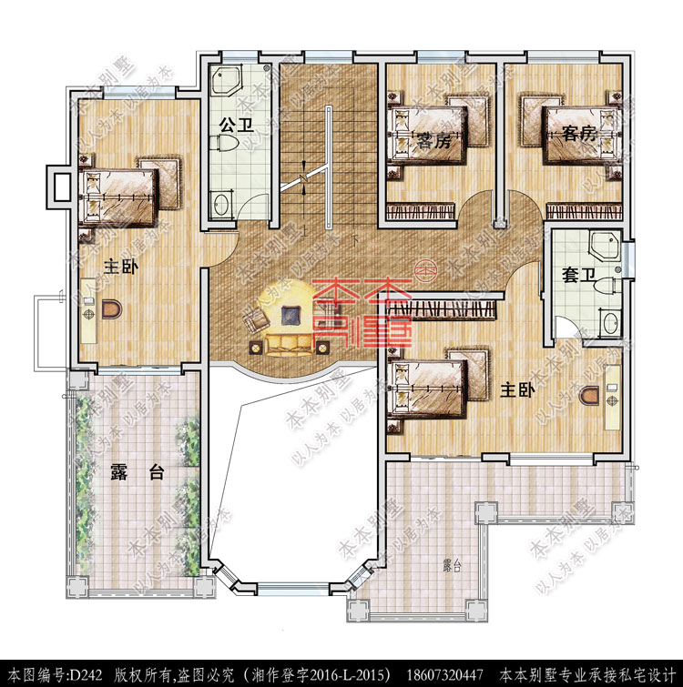 二層:茶室,主臥(帶衛(wèi)生間,書房,露臺(tái)),兒童房(帶書房,露臺(tái)),二間客臥,公衛(wèi),樓梯。