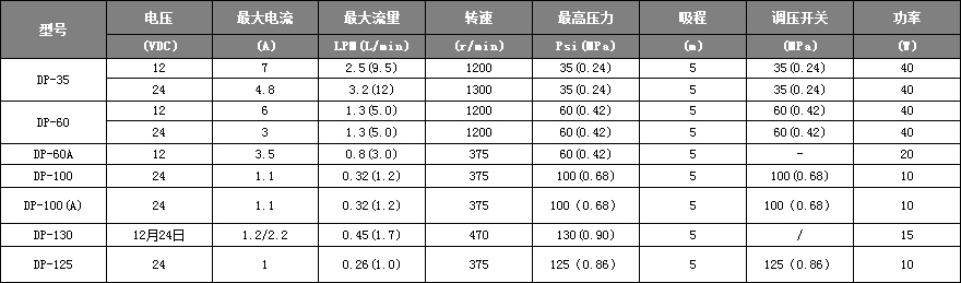 2.裝有隨泵附帶的進出口接頭,DP-130 DP-125 DP-100 DP-60型微型隔膜泵進出口采用ZG3/8″外牙G29/64″彎管接頭;DP-35隔膜泵進出口采用3/8″外牙軟管接頭.