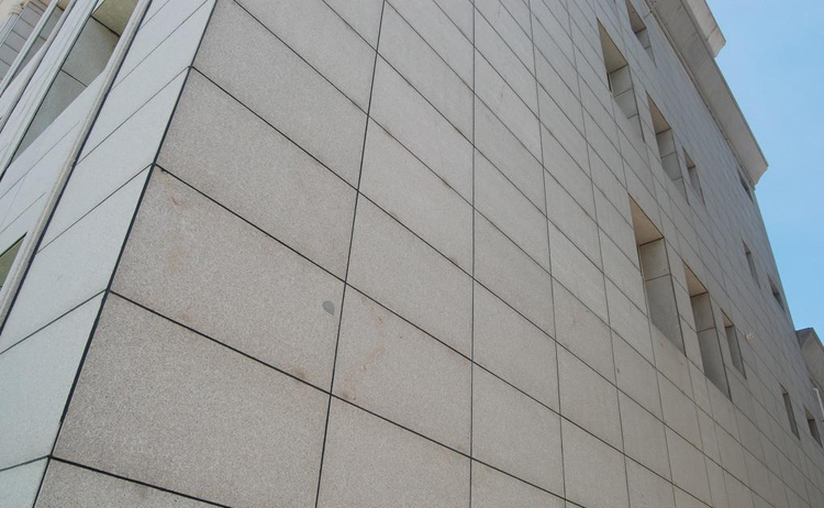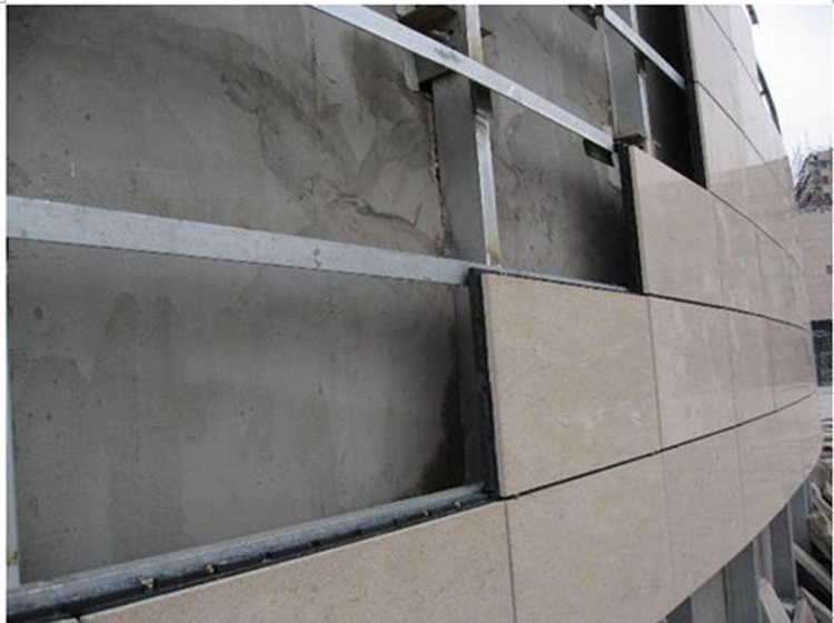 以鋼筋混凝土框架為基本,在基本上固定縱橫龍骨支架,最后用專用固定件將花崗巖固定于橫支架