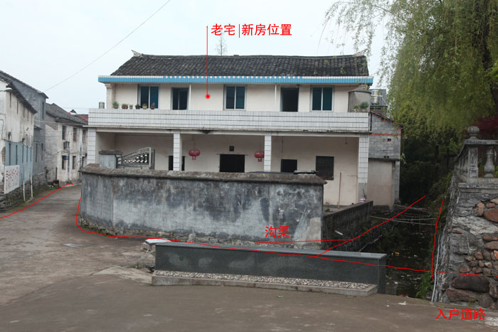 宅基地正面:入戶的路比較窄.右側(cè)是溝渠,右側(cè)鄰居的宅基地高于業(yè)主的宅基地2M左右.計(jì)劃在原宅基地上建,盡量還是保證前面的圍墻院子做大。