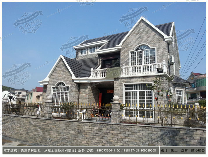 紅磚、人字坡的灰瓦、搭配一些文化石、黑色的鐵藝欄桿、米色的檐口、在輔以成品天溝、感覺(jué)出來(lái)了。